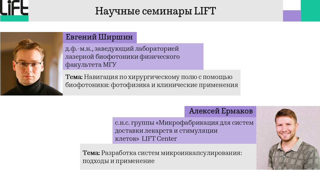 Биополимерные материалы нашли множество применений в биотехнологии и медицине. В своем докладе старший научный сотрудник группы «Микрофабрикация для систем доставки лекарств и стимуляции клеток» Научно-исследовательского центра LIFT расскажет о применении микрокапсул для целевой доставки веществ, методах их удаленного высвобождения и других перспективах использования полимеров.
